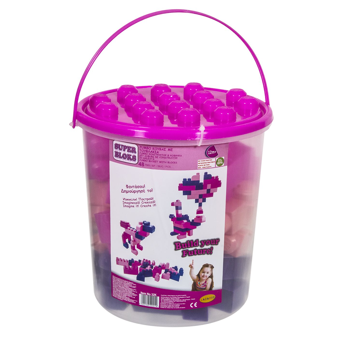 Κουβάς με 48 Μεγάλα Τουβλάκια για Κορίτσι Διαμετρος 25cm x Υψος 26cm