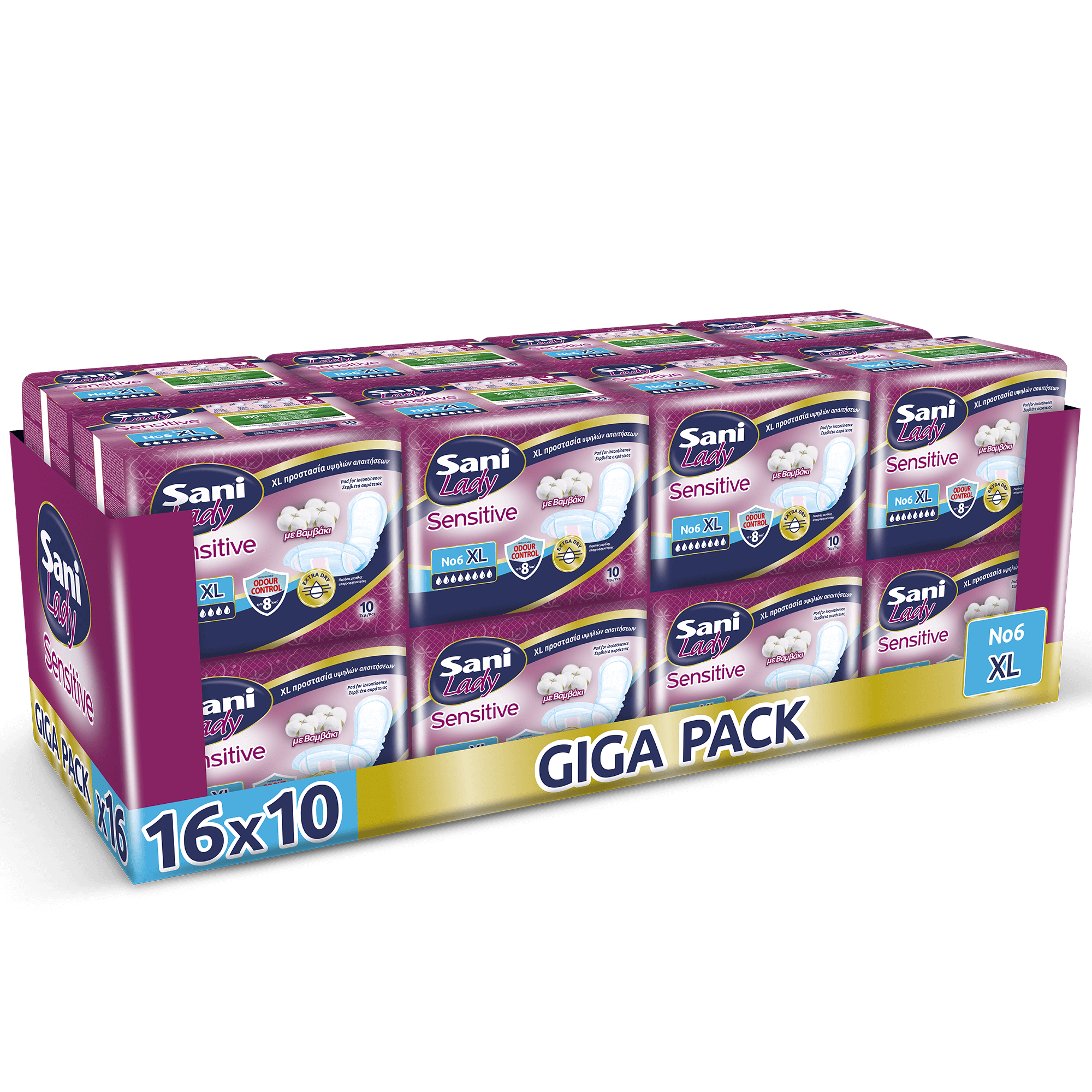 Σερβιέτες ακράτειας με βαμβάκι Sani Lady Extra Large No6 Giga Pack (16X10τμχ) (Κιβώτιο)