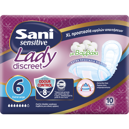Οι σερβιέτες Sani Lady Sensitive discreet με βαμβάκι είναι λεπτές και διακριτικές, ειδικά σχεδιασμένες για μέτριας έως βαριάς μορφής ακράτεια κι άλλες ειδικές χρήσεις, όπως λοχεία και μετεγχειρητικές καταστάσεις.