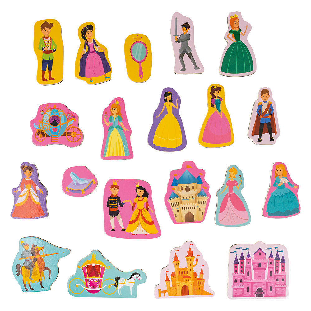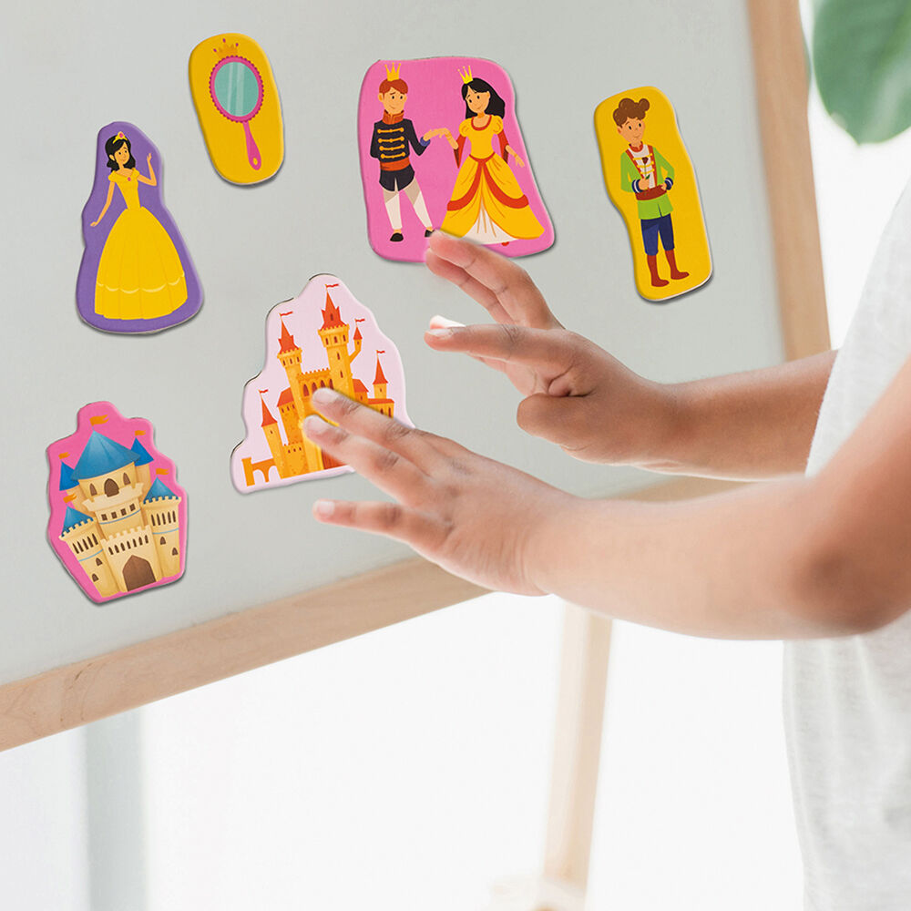 Τα παιδιά λατρεύουν τις πριγκίπισσες, τα κάστρα και τα παραμυθένια βασίλεια! Τα παιδιά επίσης λατρεύουν το παιχνίδι με τους μαγνήτες! 20 μαγικοί μαγνήτες σε μια πρακτική ξύλινη θήκη, περιμένουν το παιδί να τους ανακαλύψει και να φτιάξει με αυτούς τους δικούς του παραμυθένιους κόσμους. Πριγκίπισσες, ιππότες, παλάτια, άμαξες και πριγκιπικά αξεσουάρ θα δημιουργήσουν ένα παραμυθένιο περιβάλλον παιχνιδιού. Τοποθετήστε τους μαγνήτες σε οποιαδήποτε μαγνητική επιφάνεια και παίξτε παιχνίδια ρόλων και φαντασίας εντός ή εκτός σπιτιού.