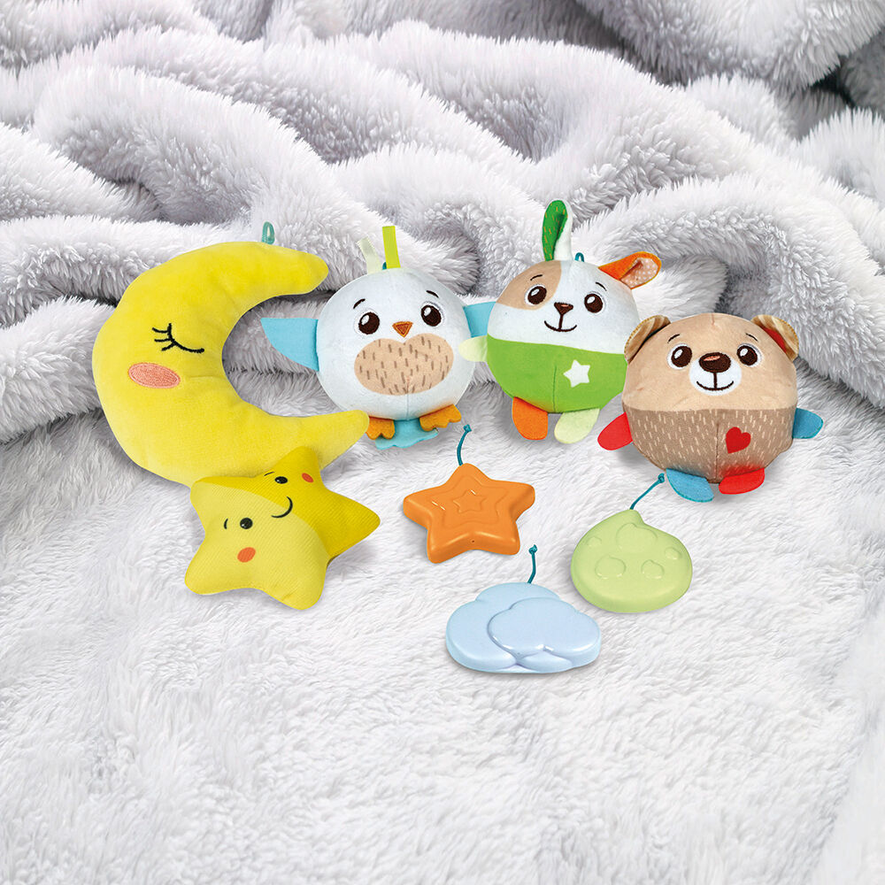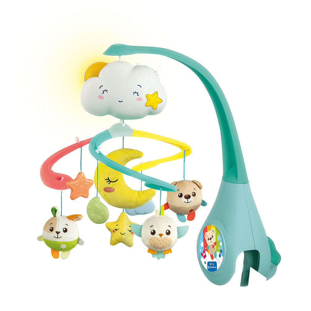 Υπέροχο περιστρεφόμενο με πολλά γλυκά και μαλακά κρεμαστά φιλαράκια. Το συννεφάκι τα κάνει να περιστρέφονται αργά, παίζοντας γλυκές μελωδίες ύπνου, ήχους της φύσης και λευκούς ήχους για να χαλαρώσει και να κοιμηθεί το μωρό. Ο χρονοδιακόπτης επιτρέπει την επιλογή μέχρι και 20 λεπτά μελωδίας. Εύκολο κλείδωμα στην κούνια. Το σύννεφο γίνεται και φορητή μουσική μονάδα.