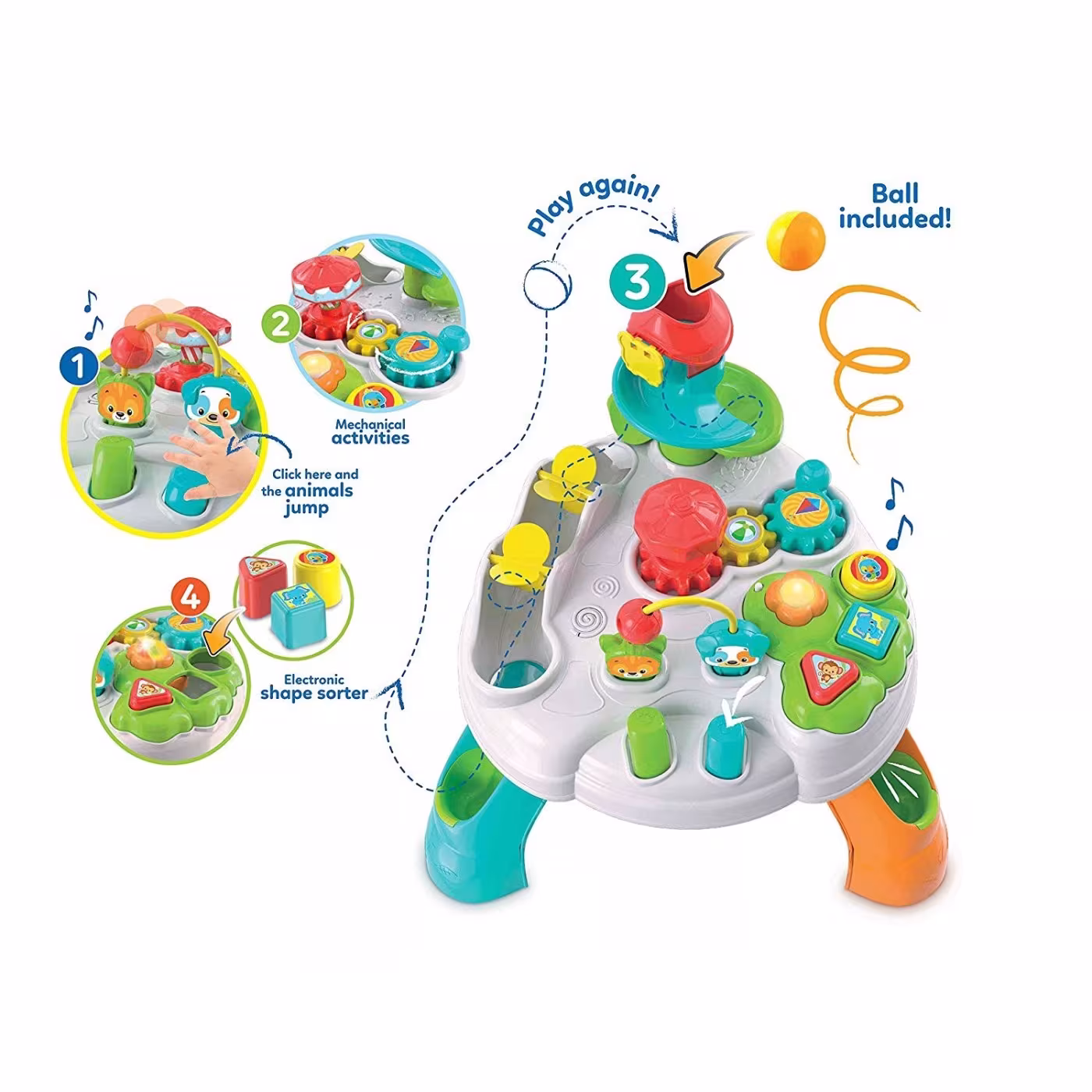 Ελάτε στο πάρκο διασκέδασης των ζώων, ένα διαδραστικό ηλεκτρονικό τραπέζι με πολλές δραστηριότητες. Διεγείρει τις χειρονακτικές δεξιότητες, την οπτική αντίληψη και βοηθά στην κατανόηση της σχέσης αιτίαςαποτελέσματος.