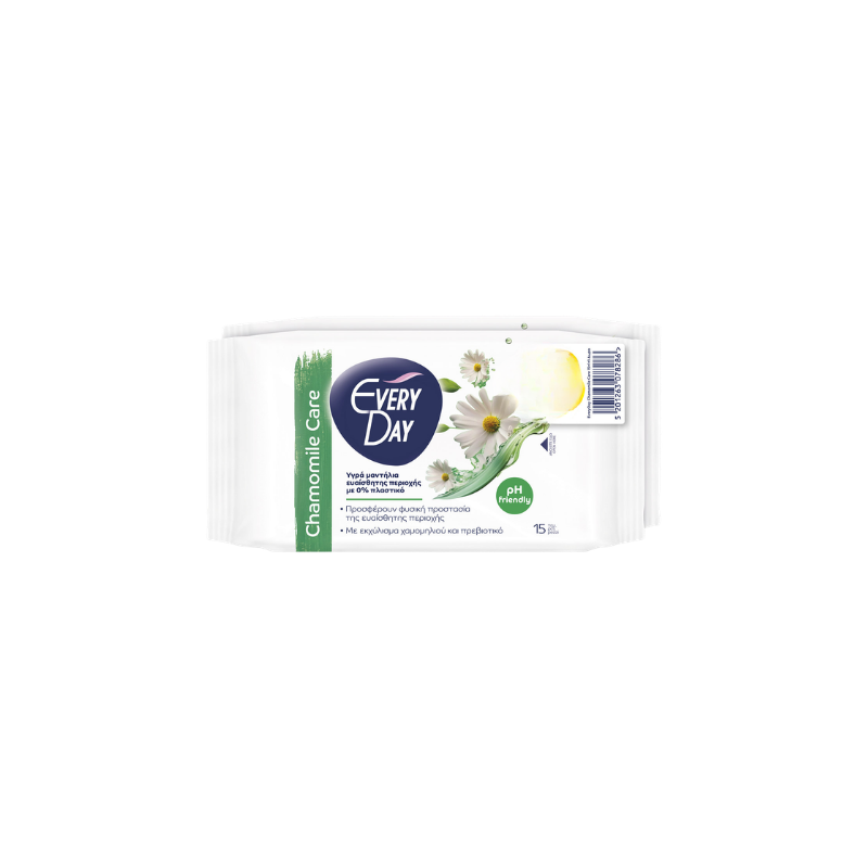 EveryDay Chamomile Care, ΝΕΑ υγρά μαντήλια καθαρισμού για την καθημερινή υγιεινή της ευαίσθητης περιοχής από 100% φυτικές ίνες, χωρίς πλαστικό. Ειδικά σχεδιασμένα για να προσφέρουν φυσική προστασία: -Εμπλουτισμένα με εκχύλισμα χαμομηλιού, πρεβιοτικό και γαλακτικό οξύ. -Σέβονται το pH της ευαίσθητης περιοχής. -Προσφέρουν προστασία και μοναδική αίσθηση φρεσκάδας, όπου και αν βρίσκεστε! Δερματολογικά ελεγμένα. Παράγονται στην Ελλάδα. Σε συσκευασία 30 τεμ