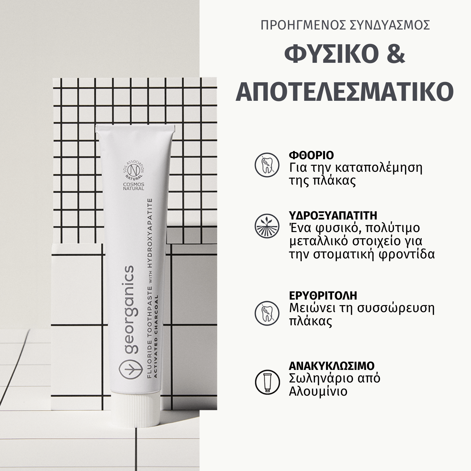 Συστατικά: Aqua, Calcium Carbonate, Erythritol, Xylitol, Glycerin, Cocos Nucifera Oil, Mentha Piperita Oil, Hydroxyapatite, Xantham Gum, Activated Charcoal, Menthol, Sodium Fluoride(1350ppm).
