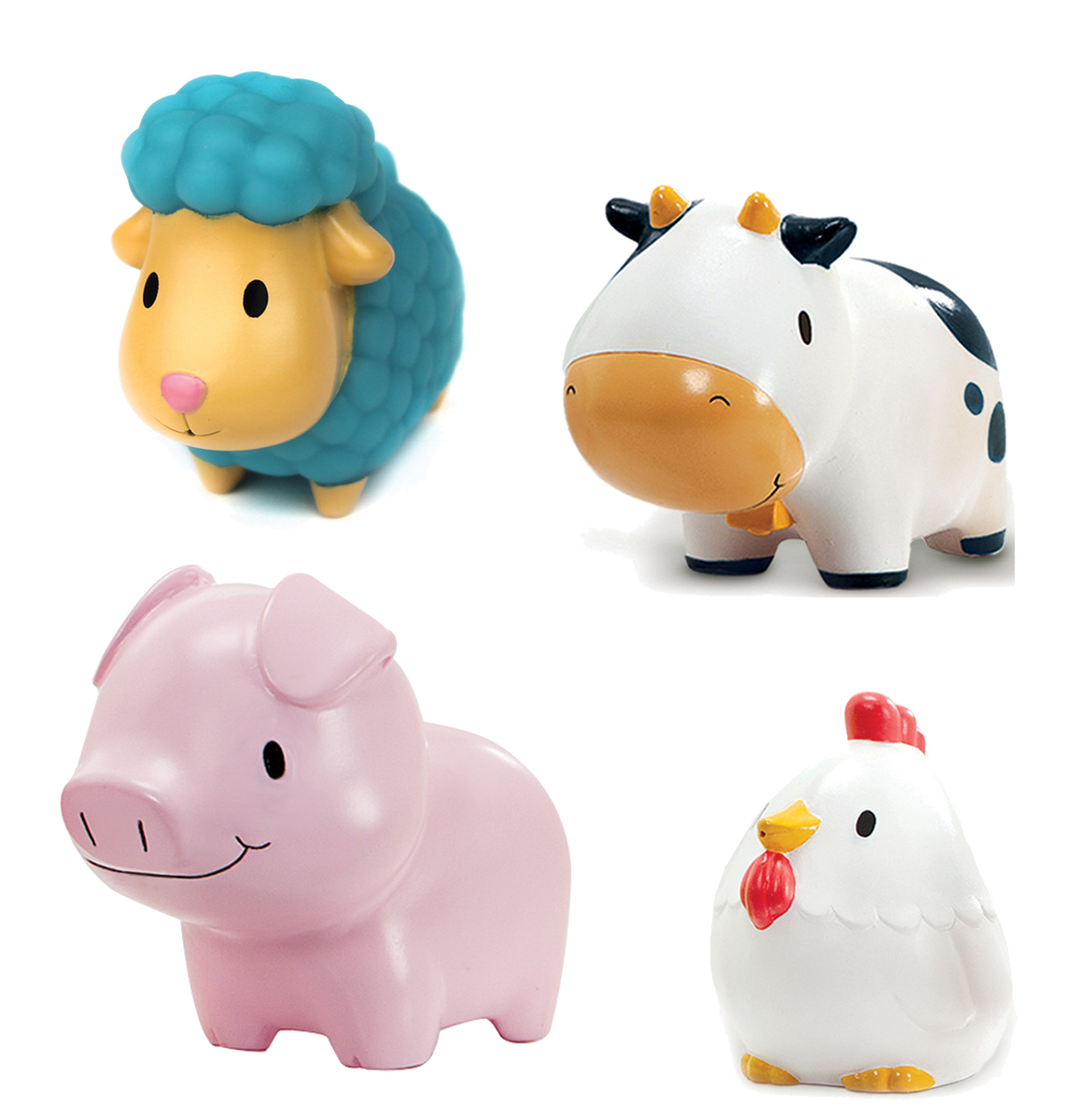 • Περιλαμβάνονται 4 ζωάκια που πιτσιλίζουν και επιπλέουν (αγελάδα, πρόβατο, κότα και γουρούνι)