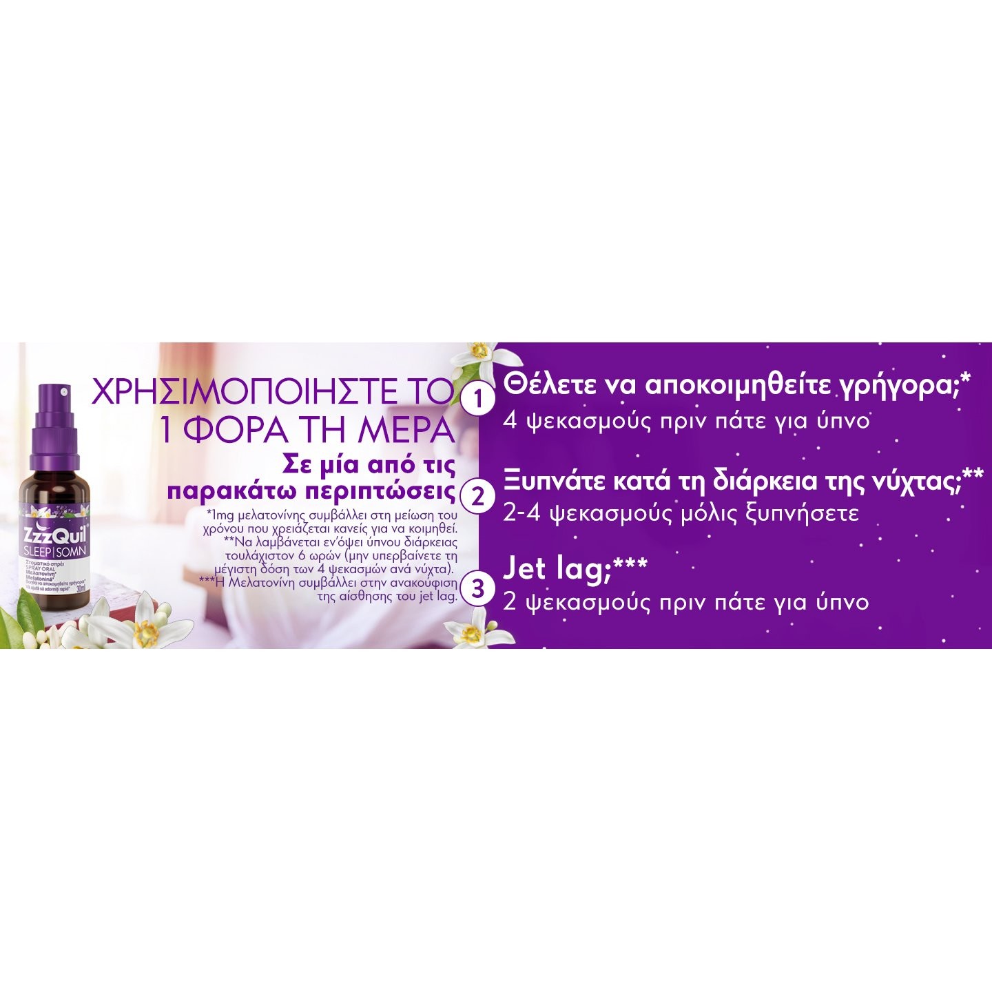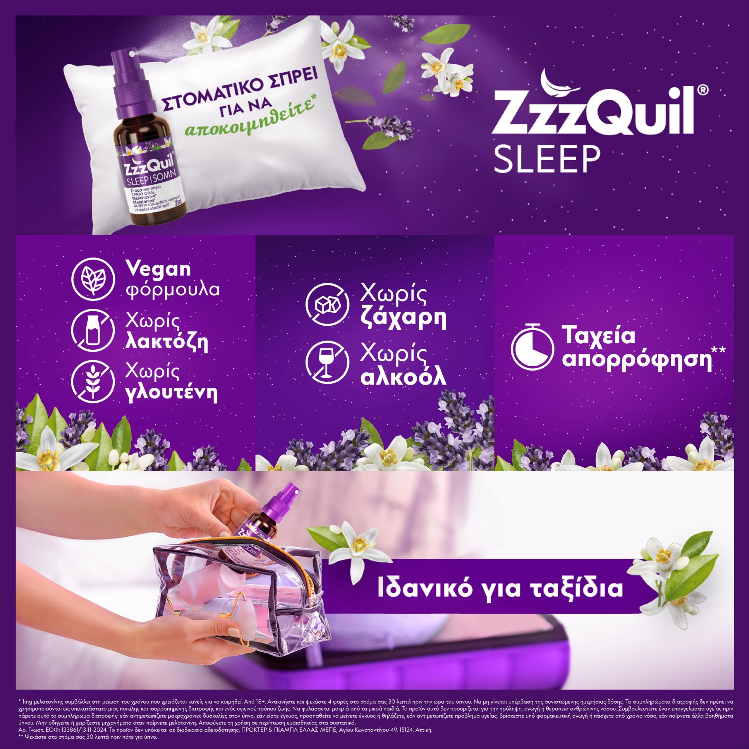 Το γρήγορα απορροφήσιμο** στοματικό σπρέι σε βολική μορφή σε βοηθά να κοιμηθείς γρήγορα*. Η ευέλικτη χρήση σημαίνει ότι είναι εύκολο να προσαρμόσεις τη δόση σου – απλά ψέκασε 2 έως 4 φορές (0,5 mg έως 1 mg Μελατονίνης) στο στόμα 30 λεπτά πριν τον ύπνο και άφησε τουλάχιστον 6 ώρες ύπνου. Με γεύση λεβάντας και πορτοκαλιού, το ZzzQuil Sleep Στοματικό Σπρέι δεν περιέχει ζάχαρη και αλκοόλ και είναι κατάλληλο για χορτοφάγους και vegan. Επιπλέον, το ZzzQuil σπρέι είναι σχεδιασμένο χωρίς τεχνητές αρωματικές ύλες, χωρίς χρωστικές, χωρίς γλουτένη και λακτόζη.